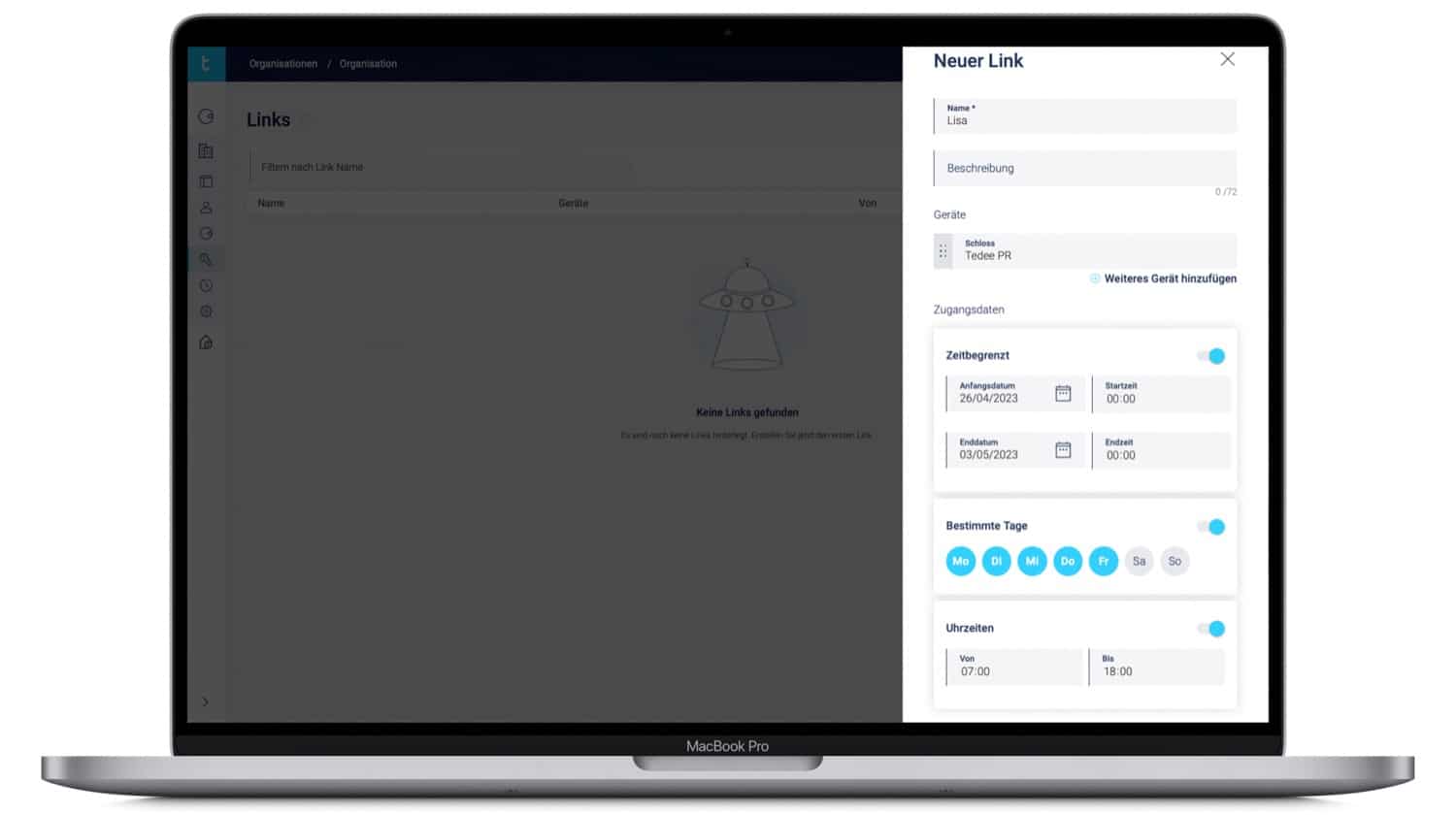 Um einen Link zu erstellen, muss das Tedee Smart Lock im Online-Portal zunächst zu einer Organisation hinzugefügt werden, was aber mit wenigen Klicks erledigt ist. Danach kann man im Menü „Links“ auswählen und die gewünschten Zugänge hinterlegen. Dabei sind die folgenden Optionen möglich: