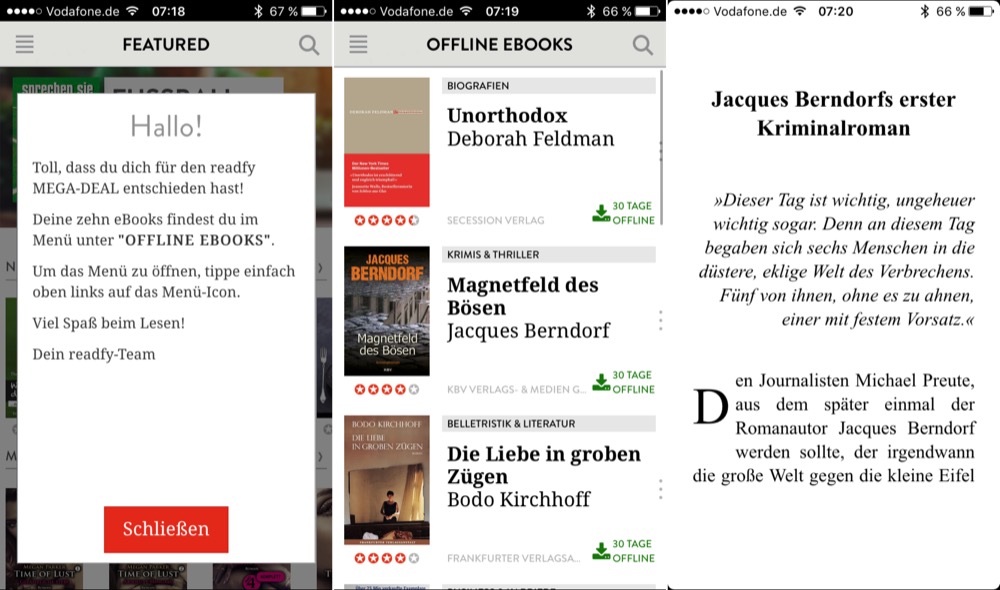 Auch ich als Vodafone-Kunde kann die eBooks kostenlos lesen. Dazu müsst ihr euch einfach auf der Extra-Seite bei Readfy registrieren und findet die 10 kostenlosen eBooks im Hauptmenü unter „OFFLINE BOOKS“. Nicht so toll: Die Readfy-App ist noch nicht für das iPhone 6 optimiert. Wir wünschen viel Spaß beim Lesen.