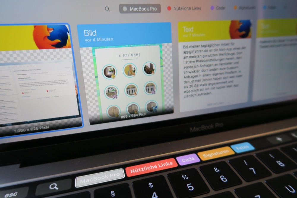 Der Funktionsumfang ist fast gleich, jedoch gibt es bei Paste ein anderes Layout und ein paar nützliche Extras. Mit dem neusten Update auf Version 2.1.1 hat der Entwickler eine Optimierung für die Touch Bar nachgereicht, mit der der Zugriff noch einfacher erfolgen kann. Denn: In Paste kann man verschiedene Bereiche anlegen, zum Beispiel Link, Porgrammiercode, Signaturen oder ähnliches, und kann dort häufig verwendete Snippets dauerhaft ablegen. Über die Touch Bar kann man diese Bereiche, die auch farblich markiert sind, schnell erreichen und aufrufen.