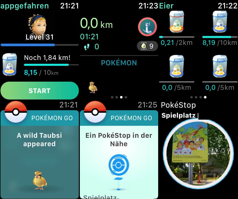 Ansonsten könnt ihr auf der Uhr alle inkubierten Eier sehen, auch das Schlüpfen der Pokémon wird auf dem kleinen Display visualisiert. Hier war ich immer ein wenig verwirrt, allerdings dürft ihr die Meldung einfach nicht berühren oder wegschieben, denn die Animation wird automatisch ausgeführt. Ich nutze die Watch eigentlich immer dann, wenn ich unterwegs bin, aber eigentlich Pokémon GO nicht aktiv spielen möchte. Ich zeichne die Wegstrecke auf, damit mehr Pokémon schlüpfen.