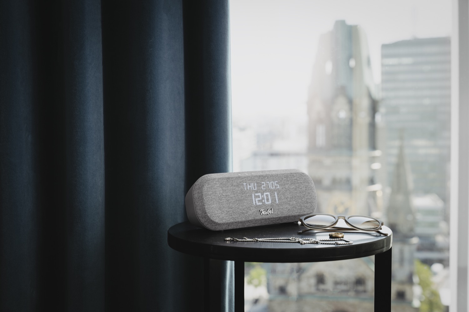 Gleichzeitig fungiert das Radio One auch als Wecker. Zur Wahl stehen zwei separate Wecker, ein Sleeptimer sowie Tasten für Bluetooth, UKW und DAB+. Das Display hinter einer Stoffbespannung zeigt alle wichtigen Details an und kann auch abgedunkelt oder ausgeschaltet werden. Möchte man nicht von Radiomoderatoren geweckt werden, kann man auch vier vorinstallierte Wecktöne nutzen. Der Wecker-Ton Berlin ist übrigens das Glockenspiel der Gedächtniskirche.