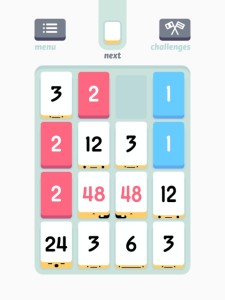 Die Blöcke können in Threes! natürlich nicht irgendwie kombiniert werden. Zunächst gilt es aus den Blöcken “1″ und “2″ eine “3″ zu bilden. Danach kann man nur noch Blöcke mit der gleichen “Augenzahl” miteinander kombinieren, wobei die Zahlen sich immer duplizieren und damit am Ende mehr Punkte ergeben. Das klingt vielleicht ein wenig kompliziert, wird in einem englischsprachigen Tutorial aber Schritt für Schritt erklärt und ist schnell verinnerlicht.
