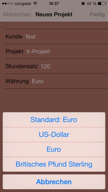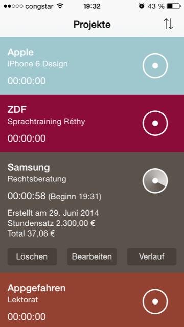 Die Arbeitsweise von Time Recorder ist denkbar einfach und schnörkellos. Über bereits vorgefertigte farbige Blöcke wird ein neues Projekt angelegt, das dann mit den notwendigen Informationen zu Titel, Kunde, Stundensatz und Währung (Euro, US-Dollar, Britisches Pfund) versehen und in die App eingepflegt werden kann. Prinzipiell lassen sich beliebig viele Projekte anlegen, die dann übersichtlich in einer einzigen farbig unterschiedenen Liste untergebracht sind.