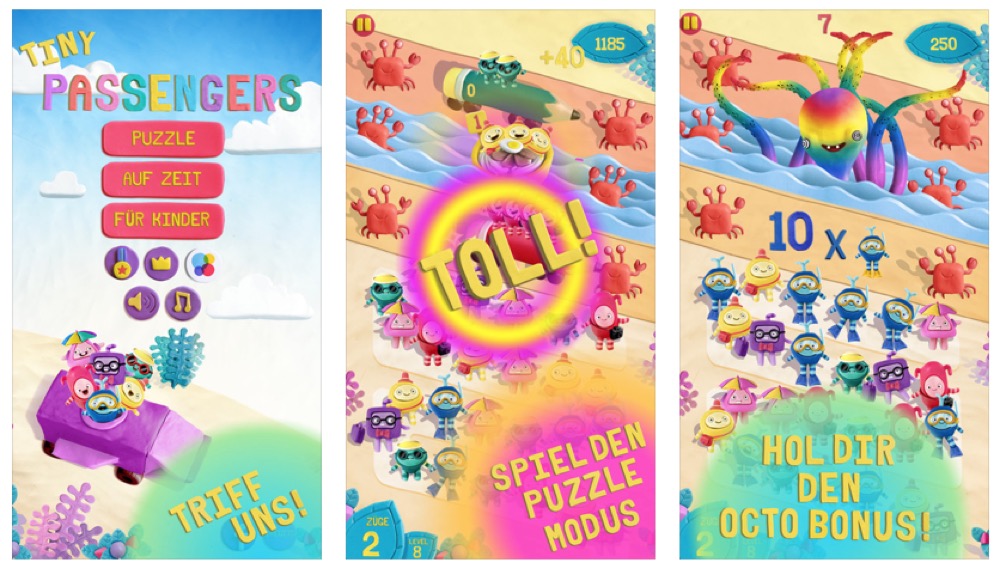 Aber auch Erwachsene dürften so einigen Spaß an Tiny Passengers haben: Durch das einfache Gameplay, bei dem die entsprechenden Figuren oder gar Kombinationen von bis zu sechs der gleichen Charaktere mittels Wischgesten in die vorbeifahrenden Gefährte geschoben werden müssen, gibt es schnell erste Erfolgserlebnisse. Zwischendurch gibt es zudem kleine Extras, wie einen Tintenfisch, der zusätzliche Aufgaben verteilt und bei Erfüllung mit hohen Bonuspunkten winkt.
