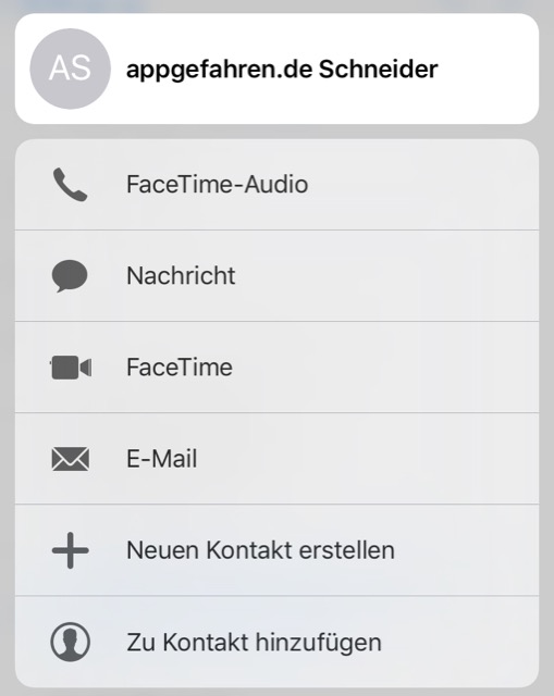 Die „Quick Actions“ müssen nicht unbedingt ausführlich erwähnt werden. Etwas versteckt sind die Schnellaktionen für Kontakte. Immer, wenn ein Profilbild eingeblendet wird, zum Beispiel direkt in der Kontakte-App, bei E-Mails oder in der Nachrichten-App, könnt ihr per 3D Touch Schnellaktionen aufrufen und so einen Anruf tätigen, FaceTime starten, eine Mail schreiben oder eine Nachricht schicken. So müsst ihr nicht erst in die entsprechende App wechseln und den Kontakt suchen.