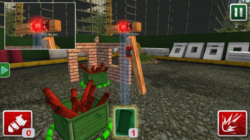 Besonders gut gefallen hat mir die Steuerung von TNT Master, die selbst auf dem kleineren iPhone-Bildschirm sehr gut klappt. Die Sprengkörper werden einfach mit dem Finger aus dem Inventar auf das gewünschte Objekt gezogen. Hält man den Finger gedrückt, wird am Bildschirmrand eine Lupe angezeigt, mit der man die Bombe noch genauer platzieren kann. Mit einem Fingertipp auf das Spreng-Symbol wird das TNT gezündet, danach gibt es kein zurück mehr.