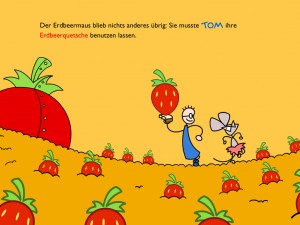 Insgesamt bietet „Tom & die Erdbeermaus“ 28 Bilderbuchseiten mit mehr als 60 Animationen. Mit einem Klick auf farblich markierte Wörter im Text können Aktionen ausgeführt werden, so dass sich zum Beispiel ein Tier bewegt. Mit einen Klick auf ein Tier, Mensch oder ein anderes Objekt führt man übrigens die gleiche Aktion durch. Mit einer Wischgeste nach rechts oder links blättert man wie gewohnt durch das Buch.