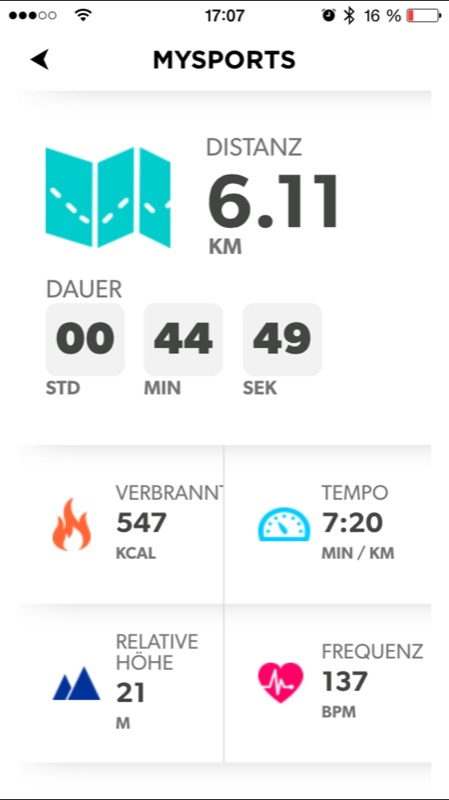 Das Layout der App allerdings wirkt modern und übersichtlich, neben Infos zur Pulsuhr und Daten des Nutzers werden die vorhandenen Trainings in einer Liste angezeigt. Durch ein Antippen kann dann eine Detailansicht mit Infos zur ausgewählten Aktivität geöffnet werden, unter anderem mit einer kleinen Übersichtskarte mit eingezeichneter Strecke, Puls, Anstieg bzw. Höhe, verbrannten Kalorien, Tempo, Distanz und Dauer. Auch Splits und grafische Auswertungen zur Geschwindigkeit, Höhe und Herzfrequenz werden dargestellt.