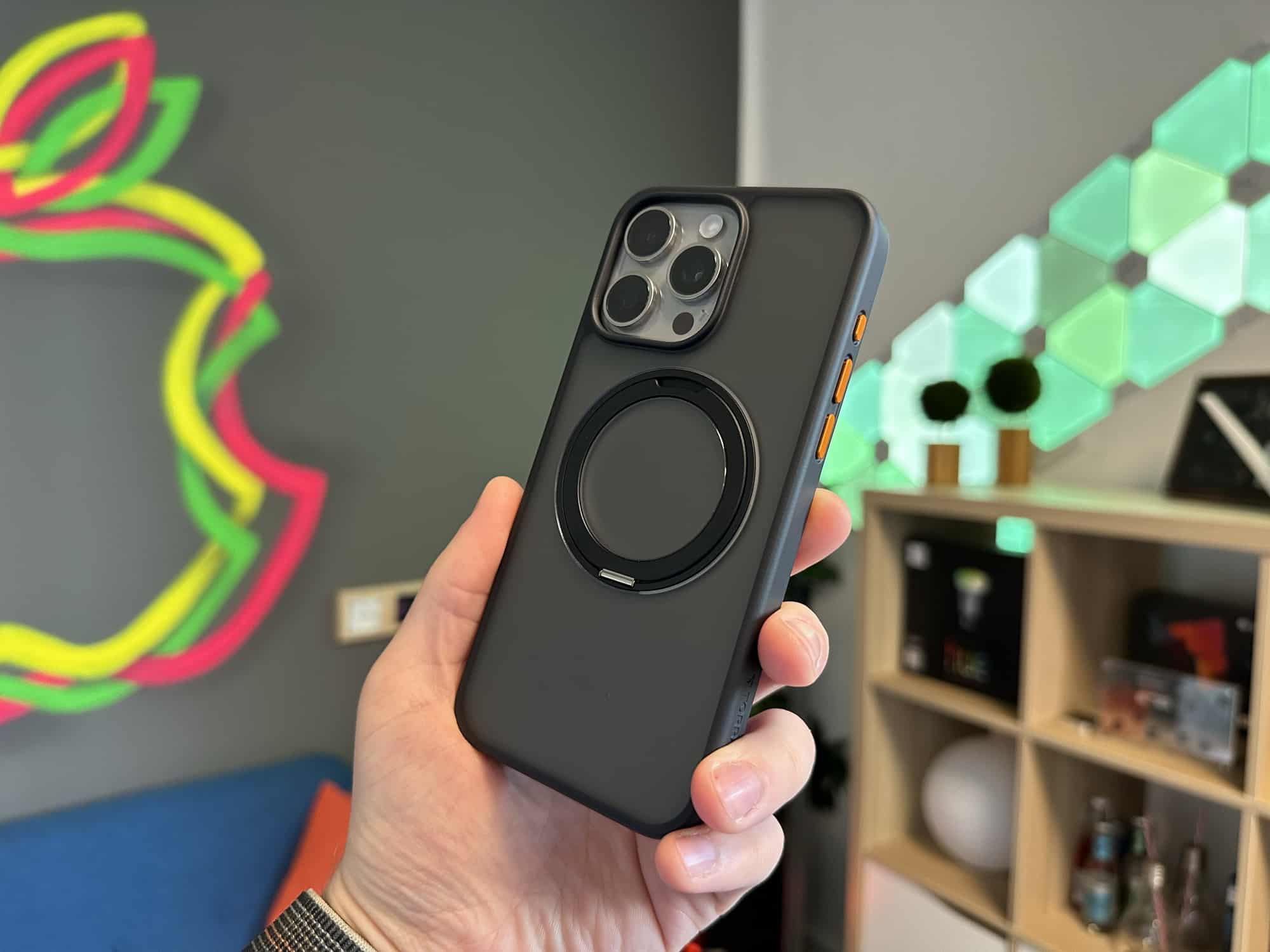 Das Torras Upro Ostand R 360° (Amazon-Link) ist eine mattschwarze Hülle, die natürlich alle Seiten und Kanten des iPhones schützt und zusätzlich durch die Wulst um das Kameramodul auch die Linsen vor Kratzern bewahren kann. Dieses Case bietet zwei Besonderheiten: Zum einen gibt es auf der Rückseite einen ausklappbaren Ring, um das iPhone aufzustellen, der sogar frei um 360 Grad gedreht werden kann. Zudem liegt im Lieferumfang ein Set farbige Knöpfe bei, hier könnt ihr die schwarzen Knöpfe für Standby, Lauter, Leiser und Action Button gegen orangene oder grüne Knöpfe austauschen (nur Pro-Varianten). So könnt ihr dem Case ein optisches Highlight spendieren.