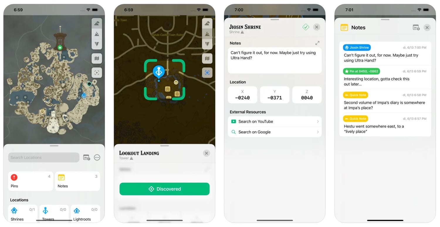 In der Mitte der App findet sich eine Karte mit allen Ebenen von Hyrule. Dort gibt es Markierungen für Schreine, Türme, Dörfer, Läden, Korok-Samen, Lichtwurzeln und viele weitere interessante Orte. Durch Antippen und Halten auf der Karte lassen sich auch eigene Pins addieren. Gamer können darüber hinaus ganz einfach Notizen zu jedem Ort und jeder Stecknadel auf der Karte hinzufügen, und es lassen sich auch während des Spiels Schnellnotizen machen. Das Spiel verfügt über eine übersichtliche Liste, in der man alle erstellten Notizen sehen kann.