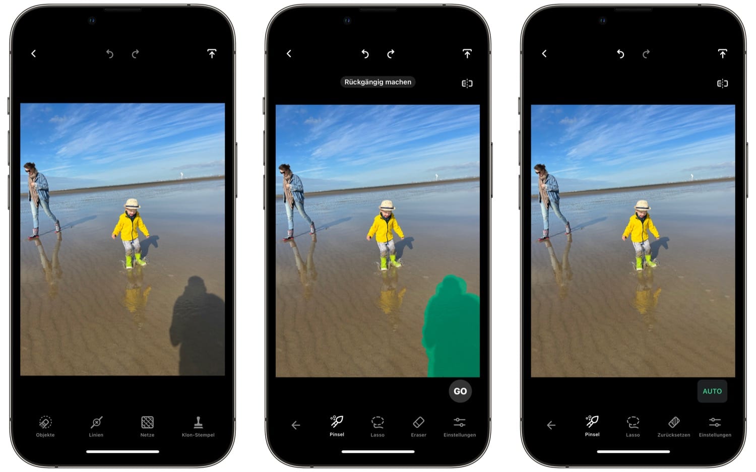 In der neuen Version gibt es unter anderem eine vereinfachte Markierung von geraden Linien sowie eine automatische Netzerkennung. Aber auch das einfache Markierung von Objekten ist weiterhin möglich und wirklich einfach. Auf den folgenden Screenshots könnt ihr sehen, wie ich meinen eigenen Schatten aus diesem Strandbild entfernt habe – und das binnen weniger Sekunden.