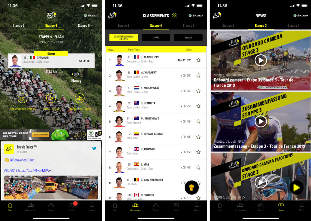 Wie schon in den letzten Jahren stellt auch 2019 der Tour de France-Betreiber Amaury Sport Organisation (A.S.O.) in Kooperation mit dem Hauptsponsor Skoda die kostenlose offizielle App zum größten Radsport-Ereignis der Welt bereit. Wer die Live-Berichterstattung der ARD (bzw. ARD One) und Eurosport nicht verfolgen kann, hat die Möglichkeit, über die TdF-App auf dem Laufenden zu bleiben.