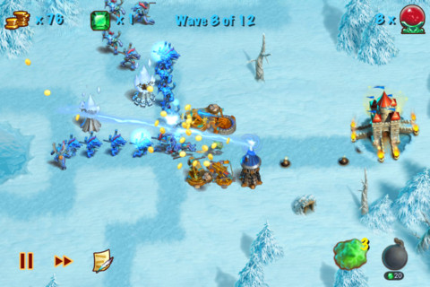 Zur Verfügung stehen natürlich mehrere Türme, die alle unterschiedliche Eigenschaften besitzen. So gibt es beispielsweise einen Frost-Turm, der die Gegner langsamer macht. Im Laufe des Spieles kann man mehrere Türme in einem Level bauen – anfangs stehen nur zwei zur Verfügung.