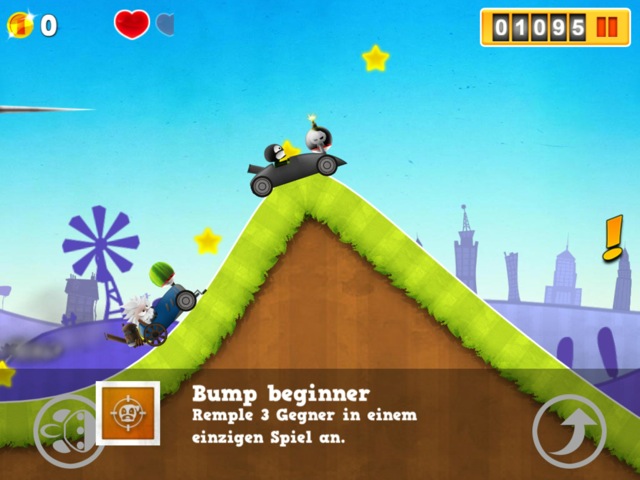 Aber trotz der niedlich-bunten Umgebung und einfach zu meisternden Steuerung wird schnell klar: Ohne baldige Upgrades zieht man schnell den kürzeren gegen die fix herannahenden Gegner. Trotz Waffenbesitz weiß man sich im schnell voranschreitenden Spiel oft nicht mehr zu helfen, der Wagen muss also aufgerüstet werden. Mit den gesammelten Münzen können so neue, bessere Teile ans eigene Vehikel gebaut werden, die für erhöhte Sprungkraft, Widerstandsfähigkeit oder Zerstörung des Gegners sorgen.