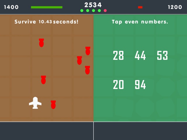 Aus insgesamt 20 Mini-Spielen werden immer wieder neue Level generiert. So muss man zum Beispiel die Augen von drei Würfeln zählen, Ufos abschießen oder entscheiden, welche Zahl eine Primzahl ist. Außerdem gilt es Zahlen absteigend zu sortieren oder farbliche Elemente zu unterscheiden. Wie man sieht: Die Spiele sind eigentlich relativ einfach, doch muss man zwei Puzzles gleichzeitig lösen, muss man sich richtig stark konzentrieren.