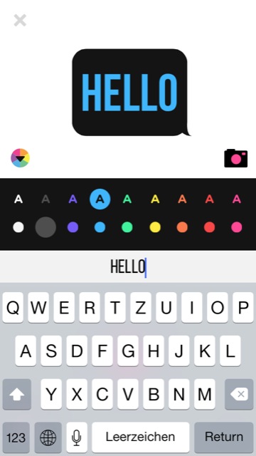 Das Erstellen von Ultratext-Messages ist auch für Anfänger ohne großartige Vorkenntnisse binnen Sekunden zu erlernen und erfordert eigentlich nur das Eintippen von entsprechendem Textmaterial und/oder Fotos. Man beginnt mit einem Wort, und Ultratext sucht automatisch eine Text- und Hintergrundfarbe dafür aus. Wer lieber selbst Hand anlegen möchte, kann dies über einen Button am linken Bildschirmrand tun und dort aus insgesamt neun unterschiedlichen Farben auswählen. Ein Kamerasymbol am rechten Bildschirmrand erlaubt das Aufnehmen von Fotos oder das Importieren von Bildern aus der Camera Roll.