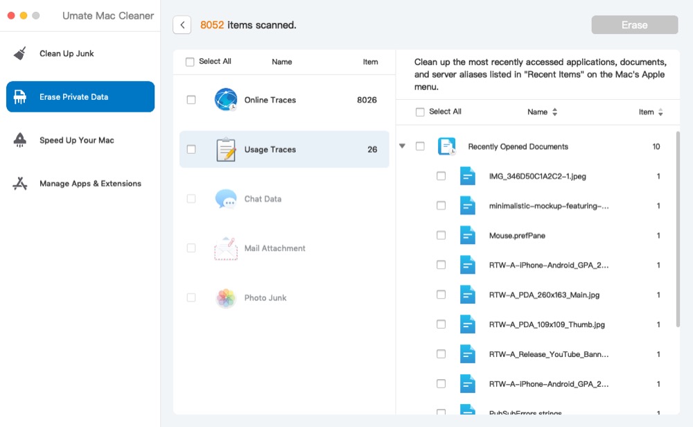 Der Umate Mac Cleaner kann eine Vielzahl an Daten finden und löschen. Der Junk-Scan findet große Dateien, Installations-Images, Papierkorb-Daten, iTunes-Überbleibsel und mehr. Ebenso können private Daten entfernt werden, darunter Chats, Mail-Anhänge, Browser-Daten und mehr.