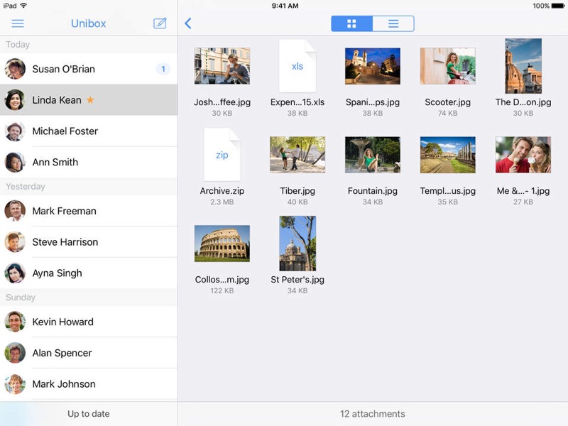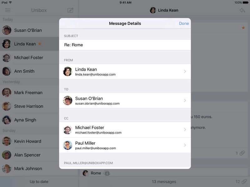 Die deutschen Entwickler von eightloops aus München bewerben ihre Anwendung mit den Worten „Mit Unibox ist deine Inbox immer aufgeräumt“. Das Prinzip, das hinter Unibox steckt, ist eine Sortierung der vorhandenen und eingehenden E-Mails nach Absender – auf diese Weise werden alle Mails und Anhänge, die man mit einer bestimmten Person ausgetauscht hat, übersichtlich in einem Thread dargestellt.