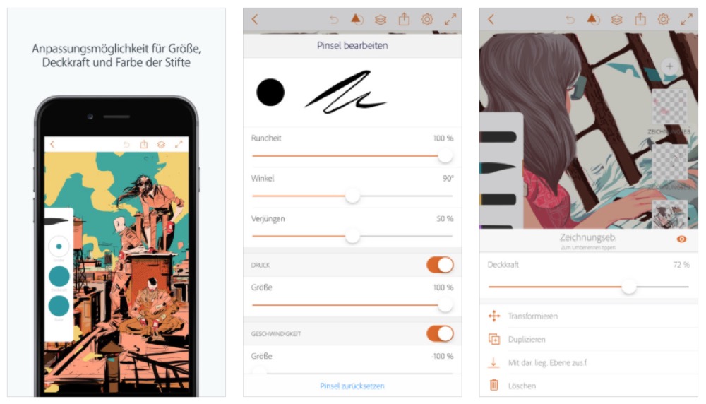 Ebenfalls optimiert wurden die Pinseleinstellungen – sie lassen sich jetzt einzeln einrichten, unter anderem hinsichtlich Geschwindigkeit und Drucksensibilität, Form und Drehung. Projekte können außerdem in v3.3 im Bearbeitungsmodus dupliziert und Zeichnungen zwischen Projekten verschoben werden. Ein 3D Touch-Support erlaubt es, schnelle Verknüpfungen durch langes Drücken auf die App anzuwenden.