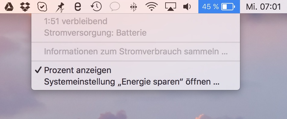 Gestern hat Apple macOS Sierra 10.12.2 zum Download freigegeben. Die neue Version behebt nicht nur viele Fehler und schließt einige Sicherheitslücken, sondern hat auch eine sonst praktische Funktion ersatzlos gestrichen. Unter 10.12.2 gibt es keine Restzeitanzeige mehr, die angibt, wann der Akku schlapp macht. Die Prozentanzeige ist weiterhin verfügbar.