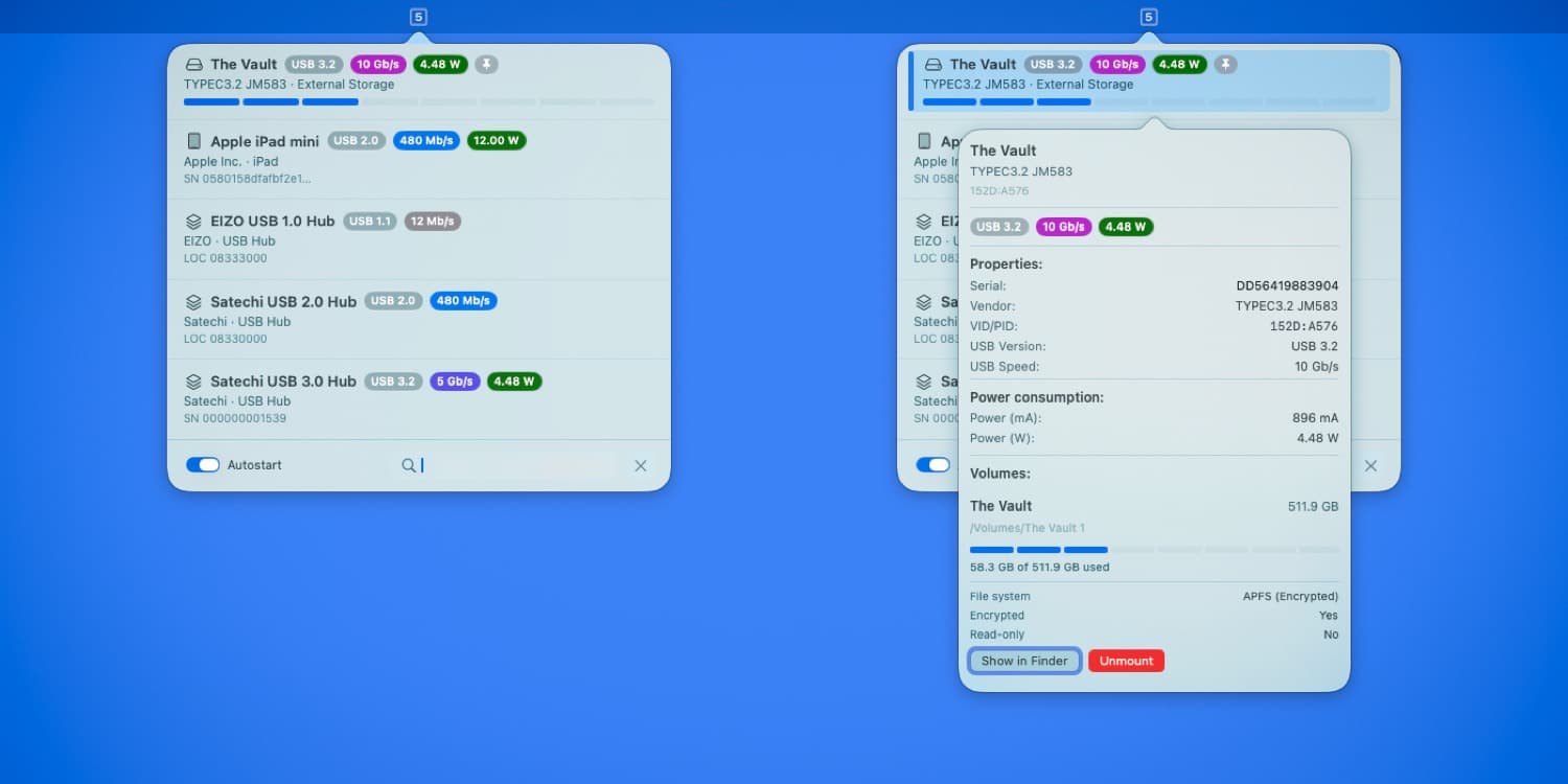 USB Status nistet sich in der Menüleiste ein und zeigt im Icon die Anzahl der angeschlossenen Geräte. Klickt man auf das kleine Symbol, öffnet sich ein kleines Dropdown, das viele weitere Details anzeigt. USB Status zeigt Namen, Hersteller und gegebenenfalls Seriennummer des Geräts. Ebenso werden USB-Standard, die maximale Übertragungsgeschwindigkeit und die aktuelle Ladeleistung angezeigt. Bei Festplatten bekommt ihr zusätzlich noch (belegten) Speicherplatz und eine Auswurf-Funktion geboten.
