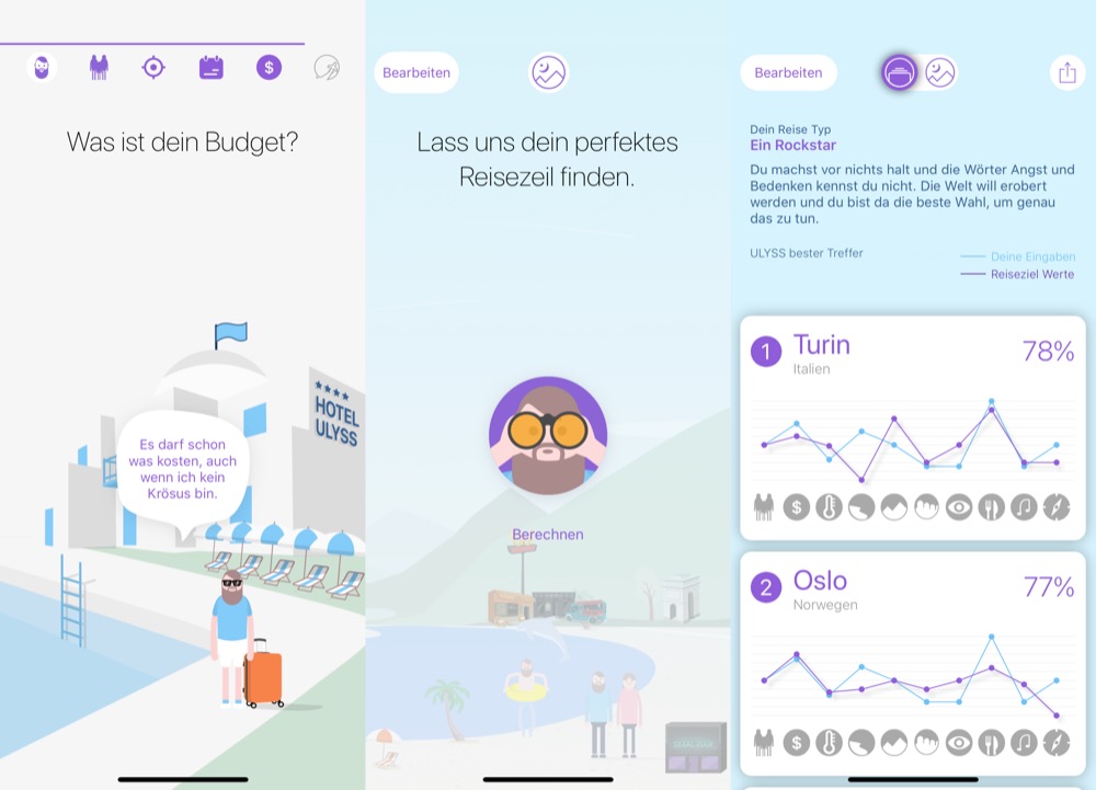 „Ulyss ist ein intelligenter Weg, um Inspiration für deine Reisen zu finden. Erzähl Ulyss von dir und erhalte perfekt angepasste Reiseziel Vorschläge, welche genau zu deinem Geschmack passen. Erkunde die Welt auf eine neue Art und Weise“, heißt es über die kostenlose App, die man allerdings nicht direkt ohne weiteres nutzen kann. Eine Registrierung per Facebook oder E-Mail ist zwingend erforderlich, zumindest aus unserer Sicht technisch aber gar nicht notwendig.