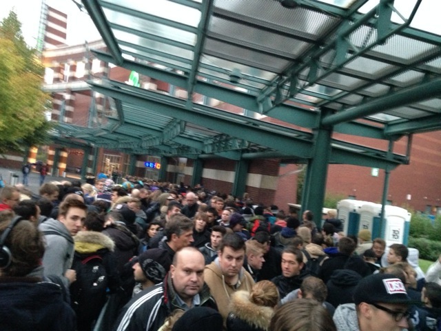 Doch wie ist die Situation vor Ort? In den elf Apple Retails Stores ist reger Andrang. Auch wir möchten natürlich das iPhone 5s schnellstmöglich bekommen, um auch euch mit ersten Eindrücken, Vergleichen etc. versorgen zu können. Fabian wartet seit Mitternacht in Oberhausen in der Schlange und hat rund 500 (geschätzt) Personen vor sich, mindestens das Doppelte hinter sich. Hier hat man wohl schon jetzt keinen Erfolg mehr, wenn man sich erst jetzt dort hin begibt – Holländer und Belgier kommen dort mit Bussen an, da man dort das iPhone 5s erst später kaufen kann.