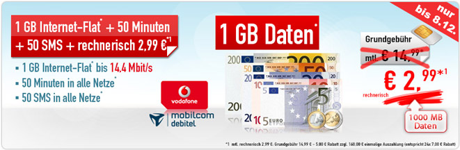 - 1 GB Internetflat mit bis zu 7,2 MBit/s