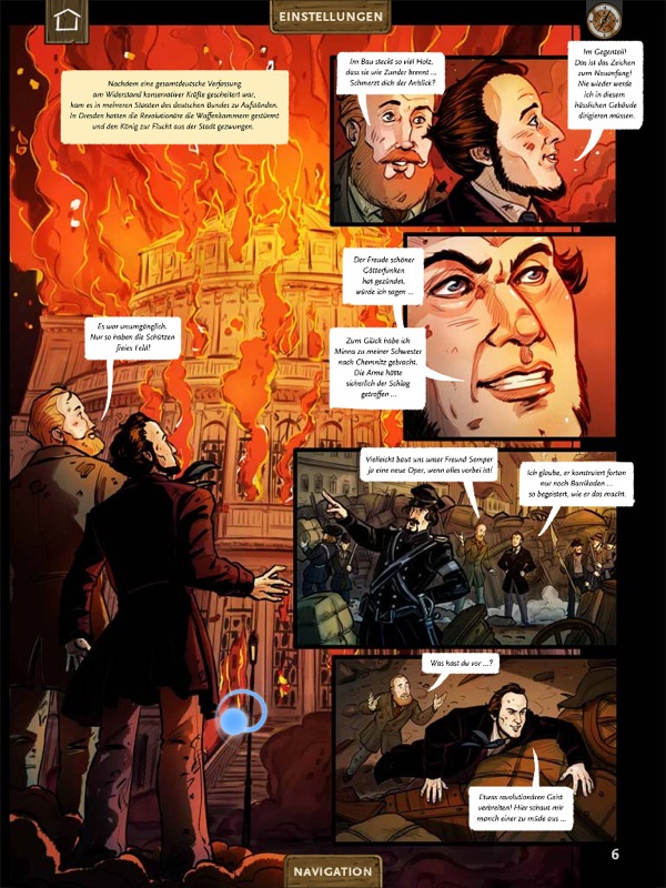 Wer sich für das Vorlesen entscheidet, darf sich rund 60 Minuten zurücklehnen und entspannen. Insgesamt gibt es 40 Seiten, die sich gerade auf dem iPhone aber in einzelne Szenen und deutlich mehr Animationen unterteilen, wobei man auf dem iPad natürlich mehr auf einer Seite sehen kann. Klasse: Zwischendurch gibt es immer wieder Zusatz-Informationen. So hat man zum Beispiel Zugriff auf eine interaktive Landkarte mit Lebensstationen von Richard Wagner.