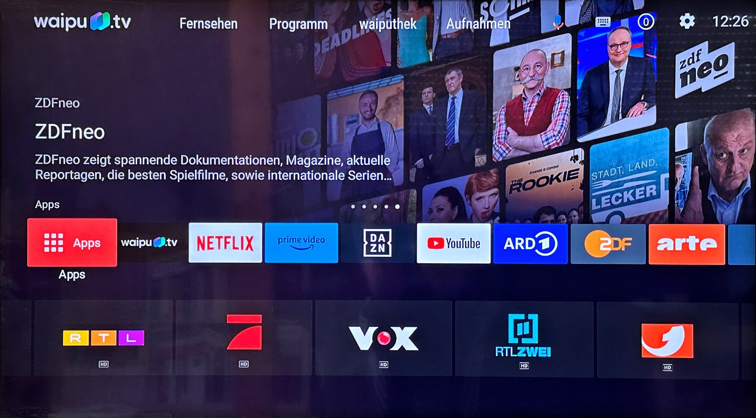Wobei es beim „einfach“ doch kleinere Einschränkungen gibt: Ganz so sinnvoll und übersichtlich aufgebaut wie die Apps für Apple-Geräte ist das Menü auf dem waipu.tv 4K Stick nämlich nicht. Hier können zwar Favoritensender markiert und prominent platziert werden, auch das Einbinden von anderen Streaming-Apps wie Netflix, Amazon Prime Video, DAZN, YouTube und der öffentlich-rechtlichen Mediatheken ist möglich – die insgesamte Performance ist jedoch im Vergleich schlechter als bei der Nutzung der App auf einem Apple TV. Mit dem 4K Stick kam es häufiger zu Abstürzen oder kleineren Lags, auch der Senderwechsel benötigte hier einige Sekunden länger.