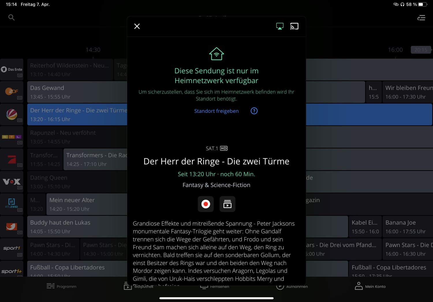 Wer sich im Apple-Universum bewegt, fährt tatsächlich mit den vorhandenen Apps für iOS, iPadOS und tvOS nach meinen Erfahrungen am besten. Ich habe während meines Testzeitraums primär die App auf meinem Apple TV 4K zum Streamen von TV-Inhalten verwendet. Hier überzeugt waipu.tv mit einem ansprechenden und gut strukturierten Menü, das über eine aktuelle Programmübersicht, Live-TV, eine übergreifende Mediathek mit On-Demand-Inhalten („Waiputhek“) verfügt, sowie auch einen Tab für erstellte und verfügbare Aufnahmen bereithält. Die Performance ist auf dem Apple TV wirklich gut, ebenso in den identisch aufgebauten beiden Apps für iOS und iPadOS, die ich mit meinem iPhone 14 Pro und dem iPad Pro 11″ (2020) nutzte.