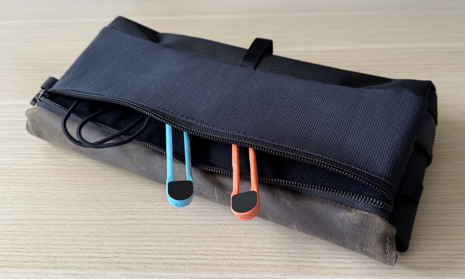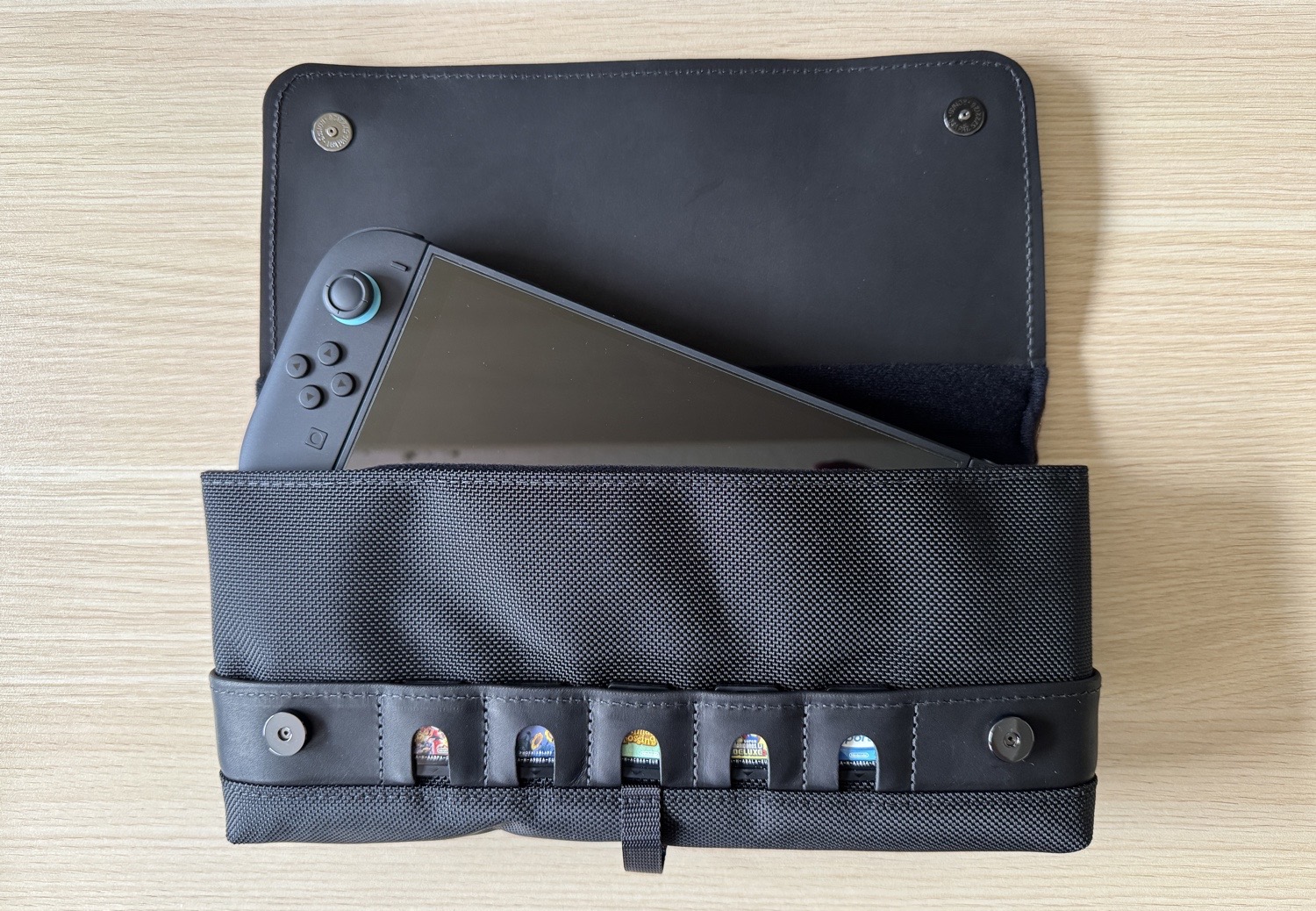 Das einzige kleine Manko, das ich auch in dieser Generation des CitySlicker Cases beobachten konnte, ist der wenige Platz für die Spiele-Kassetten der Switch oder Switch 2. Unterhalb des Lederdeckels befinden sich insgesamt fünf Einschübe, um Spiele unterzubringen. Das mag für Einsteiger und Einsteigerinnen noch durchaus ausreichend sein, bei mir haben sich allerdings mittlerweile neun Cartridges angesammelt. Einige von ihnen platziere ich nun lose in der rückseitigen Mesh-Tasche. Waterfield bietet für diese Zwecke optional noch den in verschiedenen Lederfarben erhältlichen Game Card Holder an, der 4, 10 oder 20 Spielekassetten für Switch-Games aufnimmt und mit den Switch-Taschen des Herstellers kompatibel sind.