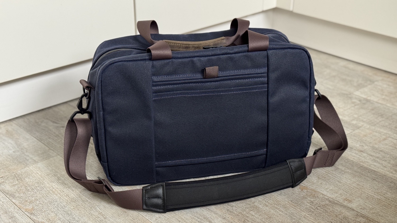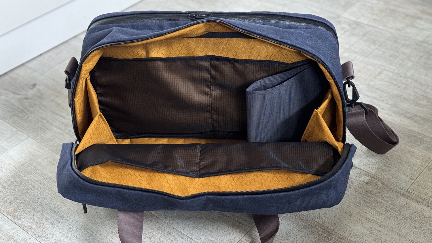 Zu den weiteren Features gehört ein Seitenfach, in dem sich zwei gepolsterte Einschübe für ein MacBook Pro mit einer Größe bis zu 16 Zoll, ebenso wie ein iPad Pro bis 13″ mit Magic Keyboard unterbringen lassen. In einem größeren ungepolsterten Einschub lassen sich Papiere oder ein Notizblock verstauen. Das Seitenfach kann mit einem Reißverschluss geöffnet werden und ist komplett vom größeren Hauptfach separiert. So kommen die technischen Geräte beispielsweise nicht mit verschwitzter Bekleidung in Kontakt, wenn man die Tasche für einen Arbeitstag im Büro und anschließendem Besuch im Fitnessstudio verwendet.