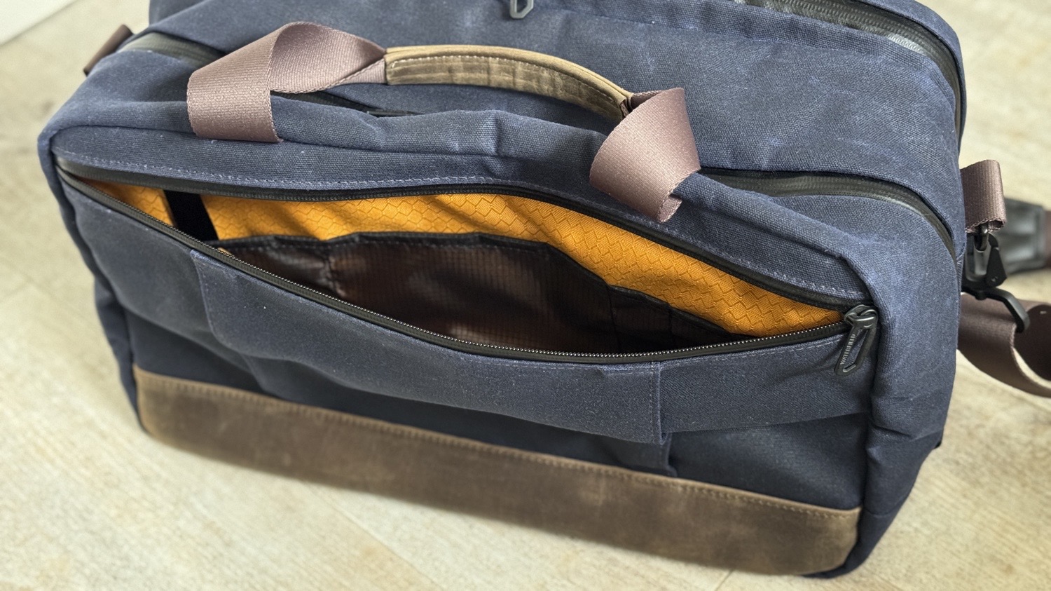 Das komplette Innenfutter ist unternehmenstypisch aus gelbgoldenem Stoff gehalten, so dass man einen hellen Innenraum hat, in dem sich Gegenstände schnell wiederfinden lassen. Zudem bietet der Stoff einen schönen Kontrast zu den in meinem Fall dunkelblauen und -braunen Farben des Außenmaterials.