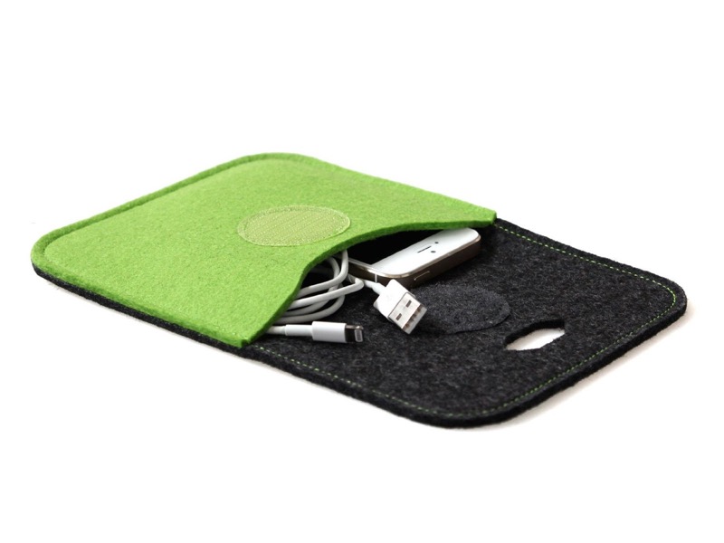 Die etwa 23 x 15,5 cm große Tasche, die aus 3 mm dickem Wollfilz genäht wurde, verfügt nicht nur über einen zusätzlichen großen, runden Klettverschluss zum sicheren Verschließen, sondern auch über einen kleinen Ausschnitt in der Deckelklappe, der sich von seiner Form insbesondere an Apple-Ladegeräte für das iPhone und iPad richtet. Mit einer Größe von 4,5 x 1,8 cm sollte sich dieser Ausschnitt allerdings auch für viele andere Smartphone- und Tablet-Ladegeräte eignen.