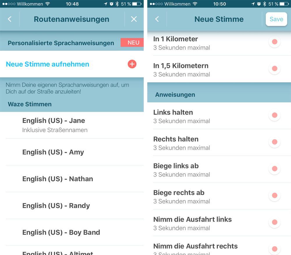 In den Einstellungen von Waze findet sich der Sprachrecorder unter dem Menüpunkt „Routenanweisungen“. Dort lässt sich ab sofort neben Stimmenpaketen verschiedener Sprachen auch eine eigene Stimme aufnehmen. Diese muss zunächst benannt werden, danach lassen sich die Sprachbefehle durch Antippen aufzeichnen. Etwas Zeit sollte man allerdings schon einplanen, denn insgesamt stehen 43 Optionen bzw. Sprachbefehle bereit. Nimmt man nicht alle Anweisungen auf, werden die verbleibenden durch die Standard-Waze-Stimme ersetzt. Praktischerweise können aufgenommene Stimmen auch mit Freunden geteilt werden – für Spaß und Abwechslung bei der Navigation ist damit auf jeden Fall gesorgt.