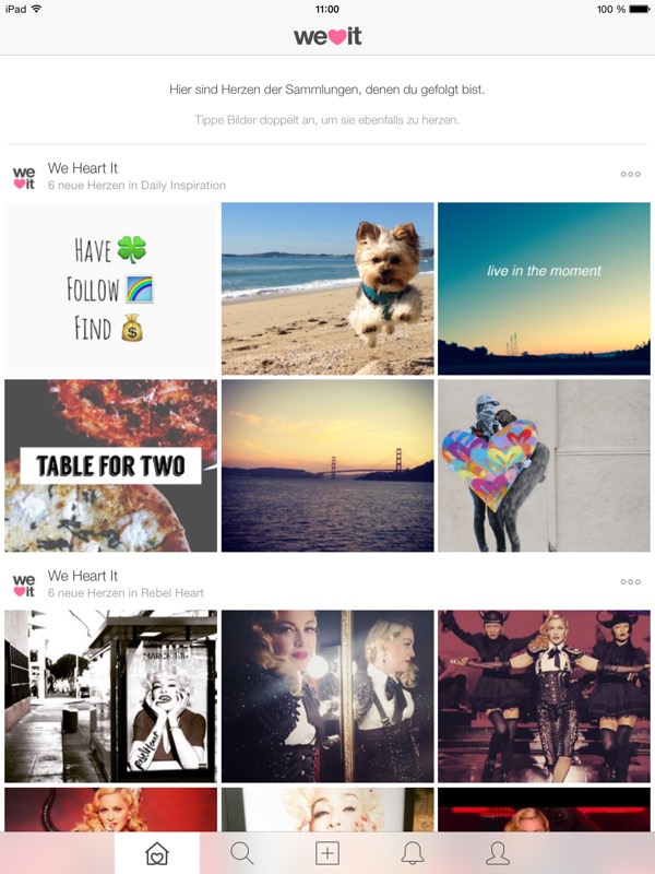 We Heart It wirkt auf den ersten Blick wie ein zweites Instagram: Es kann nach Fotos gesucht und selbige mit Herzchen favorisiert werden, dazu gibt es die Option, Nutzern zu folgen. Im Gegensatz zu Instagram können allerdings keine Kommentare unter den Bildern hinterlassen werden. Dafür gibt es aber wiederum die Möglichkeit, aus bestimmten Fotos von Usern eigene Sammlungen zu bestimmten Themen anzulegen, oder auch Sammlungen anderer Mitglieder der Community zu folgen.