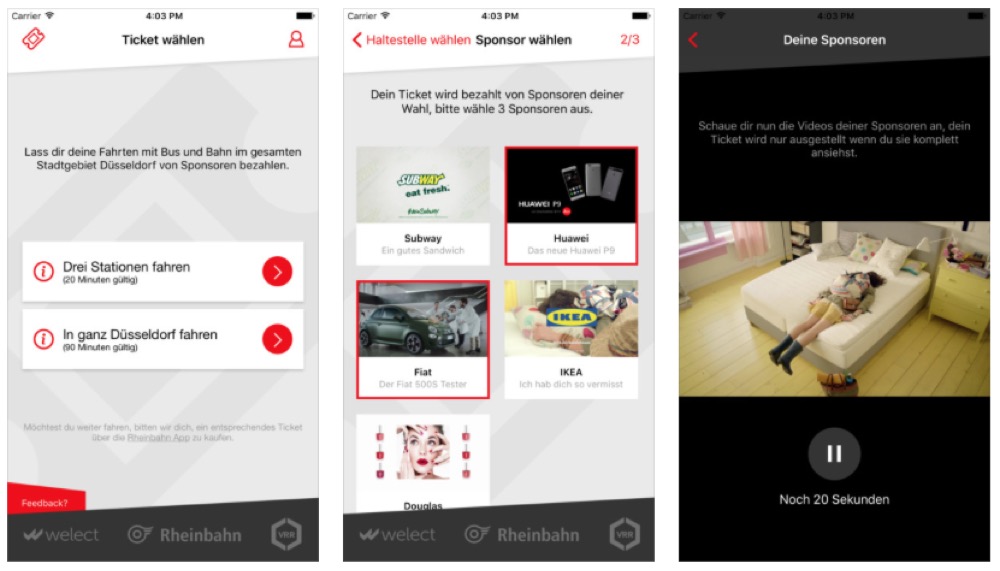 Nach Auswahl des jeweiligen Tickets kann sich der Nutzer dann für die entsprechenden Sponsoren entscheiden und hat Werbevideos der Partner in voller Länge anzusehen. Zu den Sponsoren zählen unter anderem Konzerne wie Subway, IKEA oder Douglas. User der App berichten in den App Store-Rezensionen, dass die Werbevideos zwischen 12 und 15 Sekunden lang „und damit gut zu ertragen“ (Einkaufsgott, 5.11.16) sind.