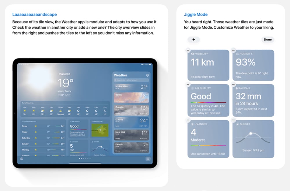 Bedingt durch die Tatsache, dass das iPad einen deutlich größeren Bildschirm als das iPhone bietet, sind in der Wetter-App entsprechend mehr Wetterinfos zu sehen. Im Querformat zeigt Timo Weigelts Konzept so beispielsweise eine Leiste mit allen favorisierten Orten an. Besonders spannend ist auch der „Jiggle Mode“, mit dem sich die Wetterkacheln ganz nach eigenen Vorlieben auf dem Bildschirm anordnen lassen. Weigelt schlägt zudem vor, Wetterbenachrichtigungen und eine macOS-Wetter-App umzusetzen. Sein Wetter-Konzept für das iPad ist auf Behance einsehbar.