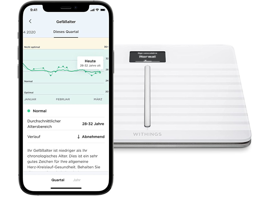 Zu dieser Produktkategorie zählt auch die Withings Body Cardio Körperwaage, die im Verlauf der Jahre nicht nur markentechnisch von Nokia zu Withings umgezogen ist, sondern auch fortwährend mit neuen Features ausgestattet wurde. Über Firmware-Updates war es beispielsweise möglich, die Pulswellengeschwindigkeit mit der Körperwaage zu messen. Kürzlich wurden die kardiovaskulären Funktionen der Withings Body Cardio um eine Gefäßalter-Option erweitert. Grund genug also für uns, dieses Feature mitsamt der smarten Körperwaage einmal selbst auszuprobieren.