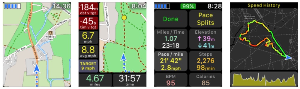 Hat man vorab Routen in die iPhone-App von WorkOutDoors übertragen, werden auch diese mit auf die Watch exportiert. Auf der Watch selbst lässt sich dann in einem übersichtlichen Menü aus verschiedensten Sportarten auswählen und eine Aktivität starten. Die dann angezeigte Live-Kartenansicht kann vom User zudem hinsichtlich der anzuzeigenden Informationen konfiguriert werden: Uhrzeit, Distanz, Geschwindigkeit, Kalorien, Herzfrequenz, GPS-Signalstärke und Workout-Dauer sind nur einige Beispiele. Für Lauf-Aktivitäten lässt sich in den Optionen der App auch eine automatische Pause aktivieren. Das iPhone kann ab der zweiten Apple Watch-Generation mit integrierten GPS-Sensor demnach bei Outdoor-Aktivitäten durchaus zuhause bleiben.