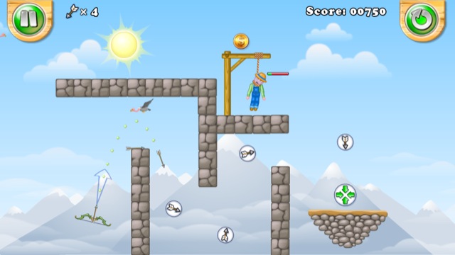Die Steuerung ist dabei ganz einfach: Man klickt auf seinen Bogen und spannt ihn mit dem Finger in die gewünschte Richtung. Wenn man die passende Schussstärke gefunden hat, löst man einfach den Finger vom Display und schon wird der Pfeil abgeschossen. Im besten Fall trifft man die Stricke der Galgen, bevor die daran hängenden Leute erstickt sind. Gleichzeitig sollte man aber darauf aufpassen, die Leute nicht direkt zu treffen – dann wird ihnen nämlich Lebensenergie abgezogen.