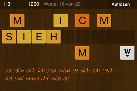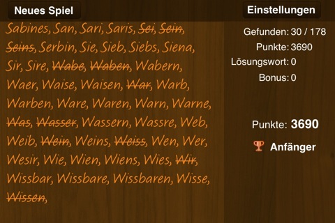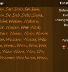 Am oberen Bildschirmrand wird neben dem Punktestand die mögliche und schon erreichte Wortzahl angezeigt. Mal sind nur knapp 30 Wörter möglich, mal um die 300 – immer abhängig von den zur Verfügung stehenden Buchstaben.
