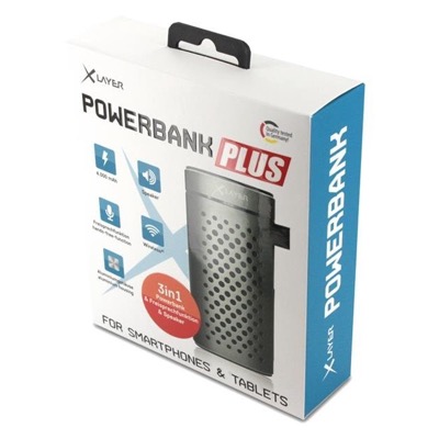 Geliefert wird das etwa 320 Gramm schwere und 13 x 6,5 x 3,5 cm große 3-in-1-Gerät inklusive eines schwarzen MicroUSB-Kabels zum Aufladen sowie einem 3,5 mm-Klinkenkabel, um auch Smartphones oder Tablets ohne Bluetooth-Verbindung mit der XLayer PowerBank PLUS verbinden zu können. Im Inneren werkelt neben dem 4.000 mAh-Lithium-Ionen-Akku mit 5V/1A Leistung auch ein kleiner Bluetooth-Lautsprecher mit 5 Watt Leistung. Über eine Bluetooth-Freisprecheinrichtung mit Lautstärkeregelung und Anrufannahme direkt am Gerät können Gespräche ganz bequem geführt werden.