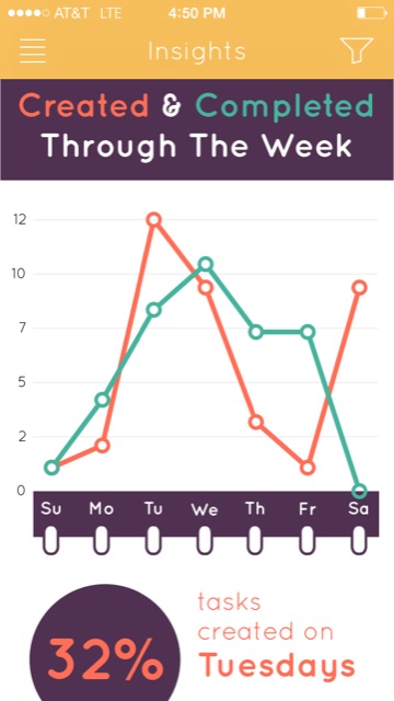 Besonders spannend sind die Statistiken: Im Menüpunkt „Insights“ verstecken sich aufgeschlüsselte Daten, die zum Beispiel alle erledigten Aufgaben in Graphen darstellen. Ebenso gibt Zippy an zu welchen Uhrzeiten die meisten Aufgaben eingetragen und erledigt wurden oder wie viel Zeit zwischen Anlegen und Erledigen lagen. Die Aufmachung ist dabei wirklich gelungen, letztlich dürfte das jedoch nur eine nette Spielerei sein – aber genau dafür brauchen wir doch solche Apps, oder?